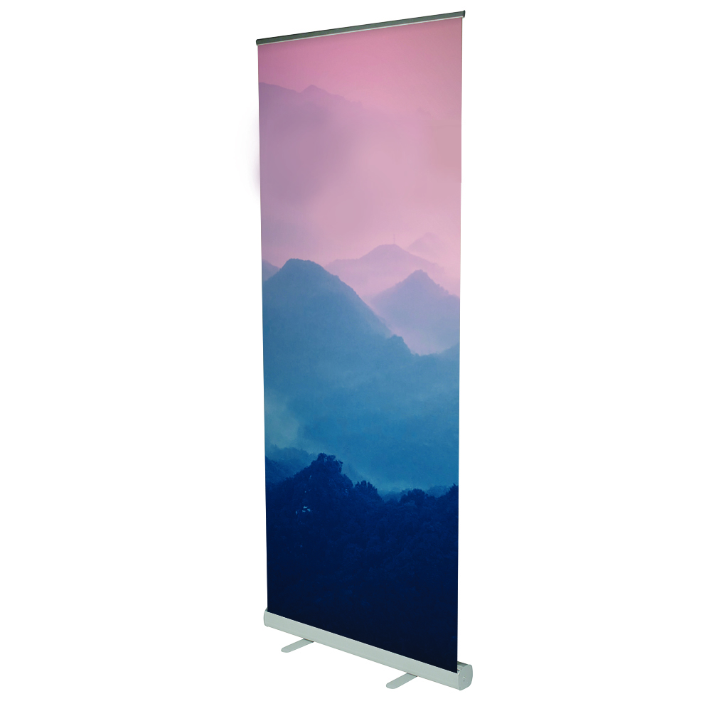Mit dem Roll-Up Banner Budget von RD-Druckshop in Osterrönfeld, Rendsburg, Kiel, Neumünster, Schleswig und Flensburg erhalten Sie ein Banner aus der Basic-Reihe. Dieser ist Silber eloxiert und kommt mit zwei ausklappbaren Füßen sowie einer Klemmschiene daher. Auch für Messen, Events, Ausstellungen, Werbeaktionen und Ähnliches eignet der Roll-Up Banner sich ideal, denn er kann einfach und bequem in der mitgelieferten Transporttasche transportiert werden.
